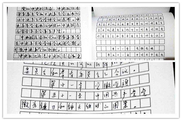在抄寫《黨章》活動中,老同志們懷著對黨的深厚感情和敬畏之心,認真學習,認真抄寫。享受政府津貼的高級工程師秘華年同志抄寫的黨章,字體端正、頁面整潔。88歲高齡的邵汝澤同志,懷著對黨的深厚感情,完成了手抄黨章;86歲高齡的家屬黨員朱連君同志,文化不高,仍然認真抄寫,將抄寫本的正反兩面全部抄滿;退休干部劉寶元同志用毛筆小楷抄寫黨章,他說:“抄黨章活動讓我們老黨員退休生活很充實,人說眼過千遍不如手抄一遍,在抄寫過程中,我對《黨章》內(nèi)容又重新學習了一遍。”在他的帶動下,兒子劉紅軍一筆一劃從頭到尾工工整整抄完了黨章。