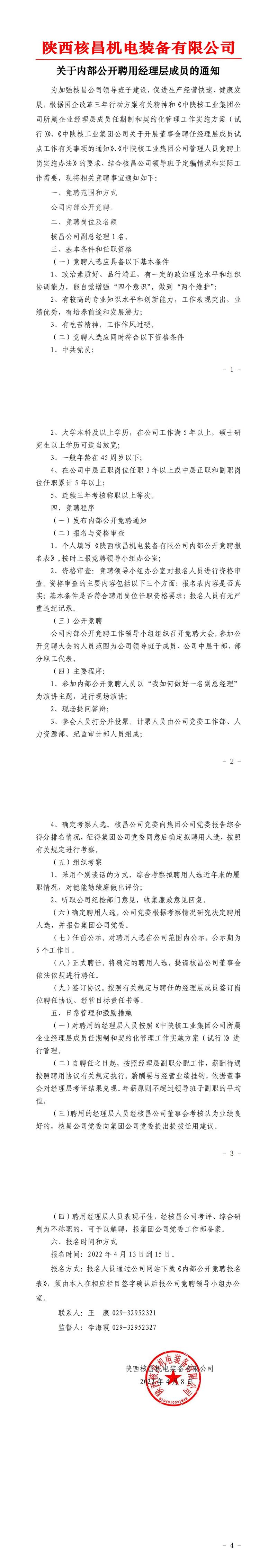 關于內部公開聘用經理層成員的通知